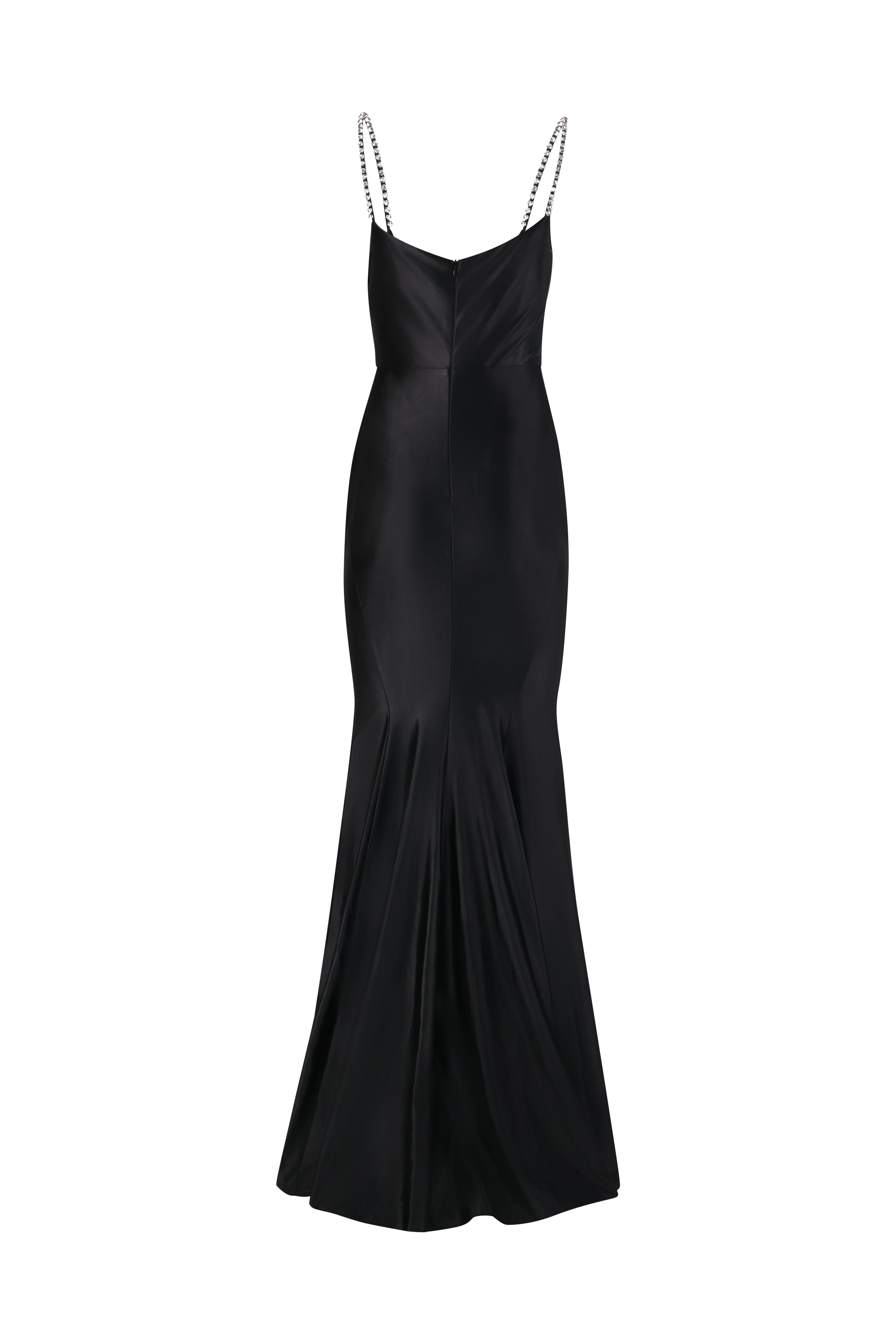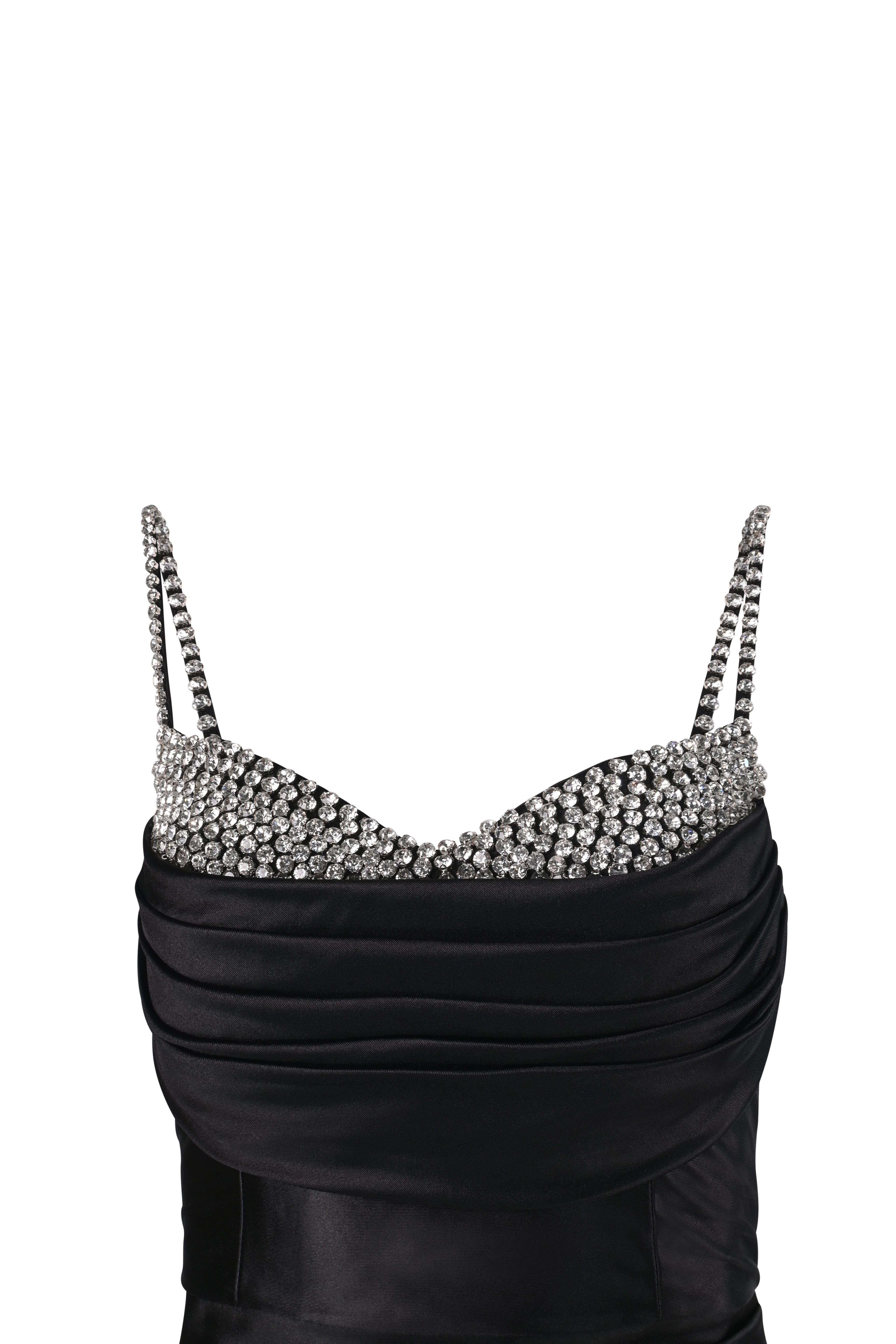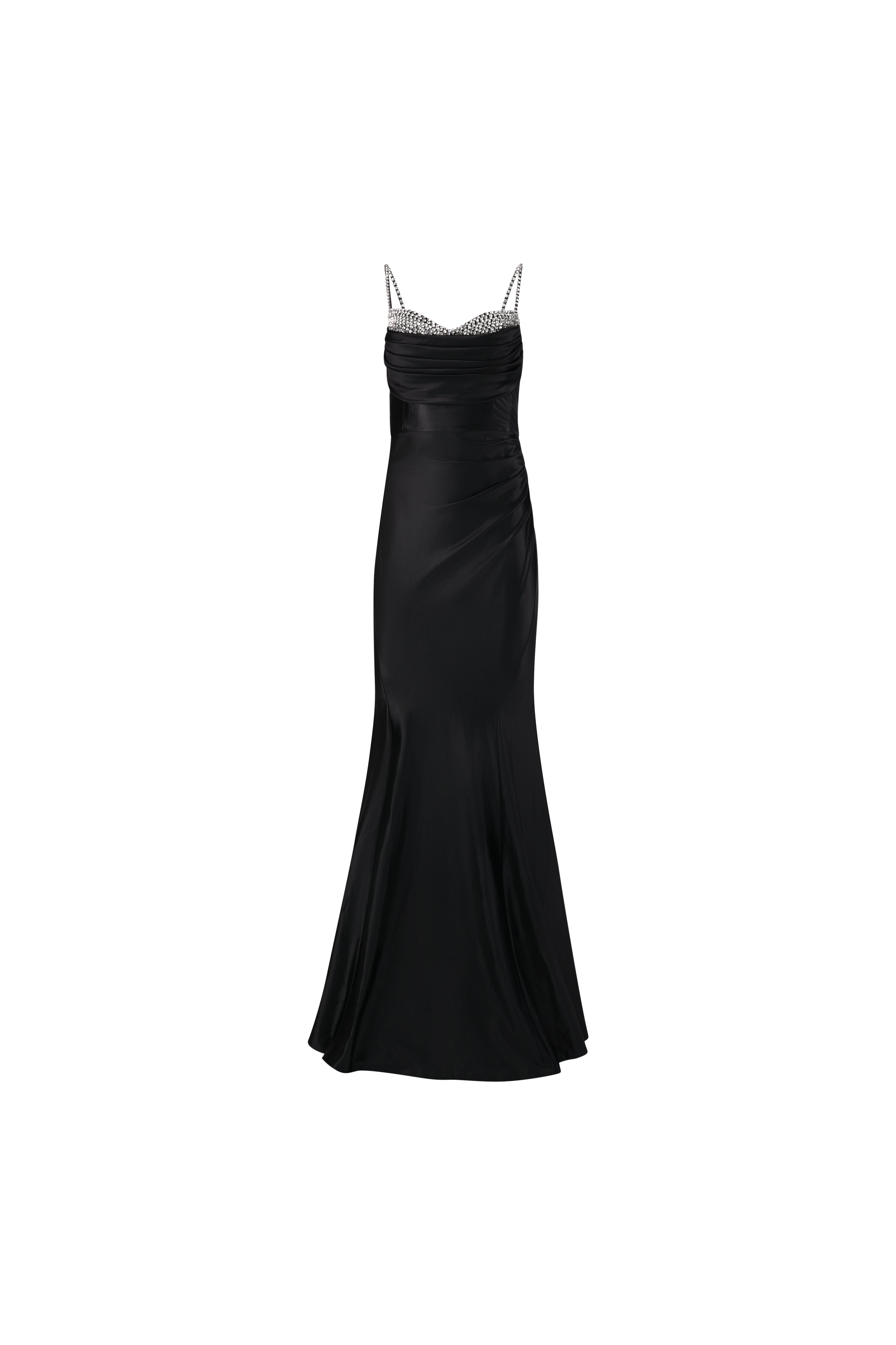 This floor-length black satin gown is a radiant ode to modern glamour. Designed with a flattering sweetheart neckline, the bust is adorned with dazzling hand-embellished crystals that cascade into dual diamanté straps — adding a glimmer of drama to every step. The bodice features soft ruching that hugs the torso while enhancing the silhouette, flowing seamlessly into a flared hem that glides with grace.